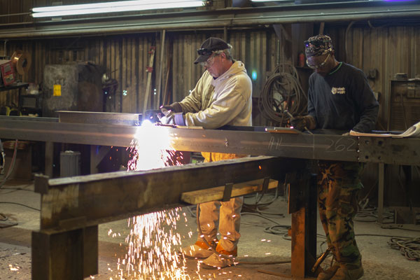A certified welder fits and welds plates onto columns and rafters at the Vulcan Steel Structures, Inc. manufacturing facility in Adel, Georgia.