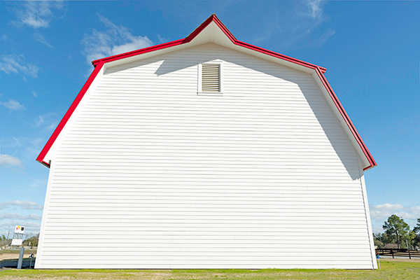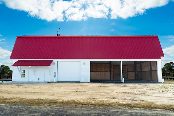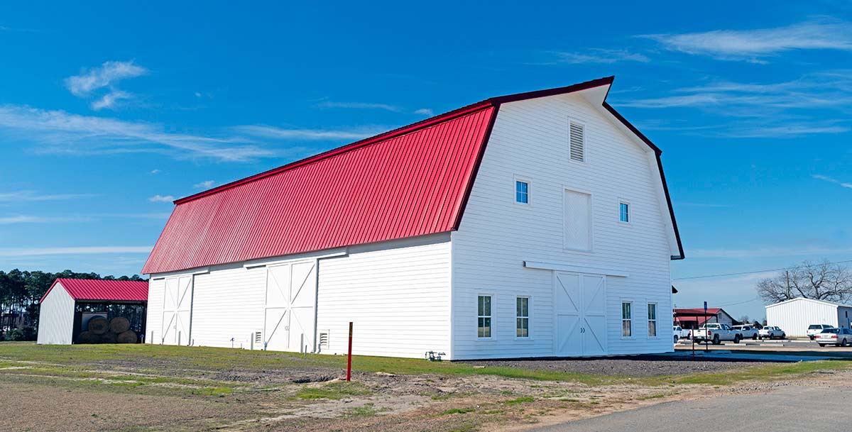Vulcan Steel Structures prefabricated the UGA-Tift on Campus Barn’s metal framework for the structure and roofing, which was erected quickly and efficiently on-site. The traditional gambrel style metal roof tops out at 42′ in height and features a 24-gauge PBR Kynar roof coated in the classic UGA-Tift on bright red that’s been quintessential to the campus since 1920.