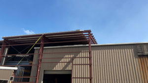 This project is an example of how Vulcan can work with a company to provide a new building while working with the existing structures. Have a look at the images below to see it under construction.The new building frame construction with the existing structure, which is currently in use, being enclosed.