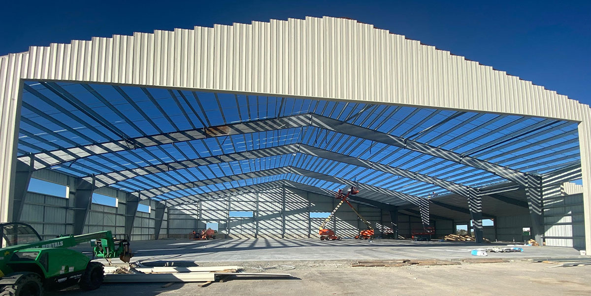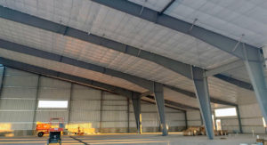Vulcan Steel Structures manufactured the metal building hangar, designed by BCS Design, Inc and being erected by Cunningham Construction, Inc. both of Olathe, Kansas. The new building is 160 feet by 140 feet and has an eave height of 24′ 6″. The hangar includes a 100-foot-by-27.5-foot hangar door, a 24-gauge Galvalume DL324 roof, and 26-gauge standard color AVP Walls.