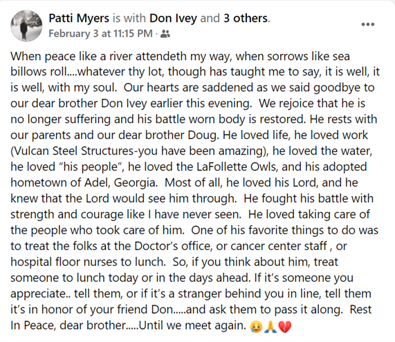 Don’s sister, Patti Myers, paid special tribute on Facebook to her brother and has allowed us to share it here.