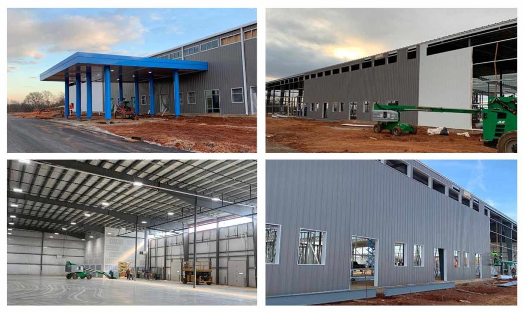 The project comprises two buildings. First is a 210-foot by 400-foot by 30-foot building with a gable-end eave design and 40-foot bays using 12-inch purlins. It has a 24-gauge Galvalume DL 324 standing-seam roof and 24-gauge Kynar PBR wall panels. The second building also has a gable-end eve design and measures 50 feet by 70 feet by 25 feet. It also features a 24-gauge Galvalume DL 324 standing-seam roof and 24-gauge Kynar PBR wall panels.