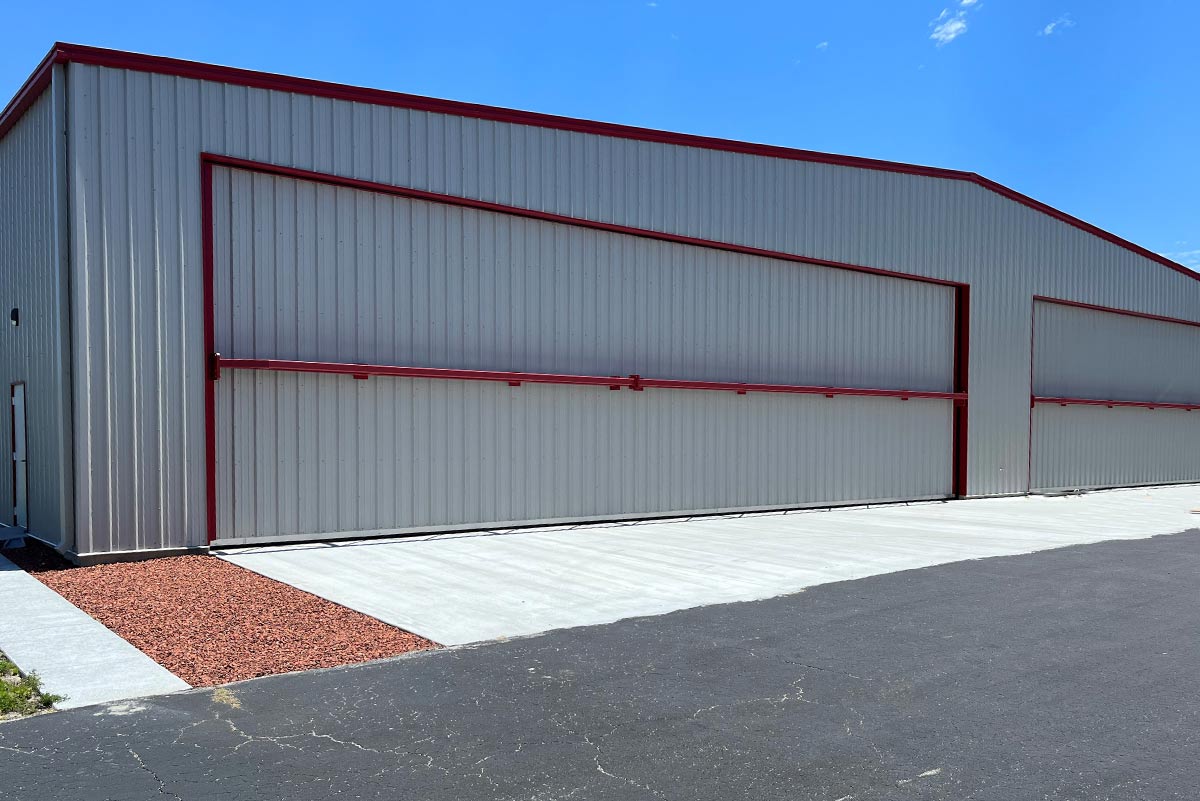 The 9100 square foot hangar is privately owned and includes a Higher Power Hydraulic Door. Built by Guy Auger of GRA Construction Inc, the gable building includes a 1/12 Roof Slope, 24-gauge Galvalume PBR Roof, 24-gauge standard color PBR Walls, two 60’ x 16’ Framed Openings, 8’ PBR Liner throughout the interior of the building and one 70’ longitudinal partition.