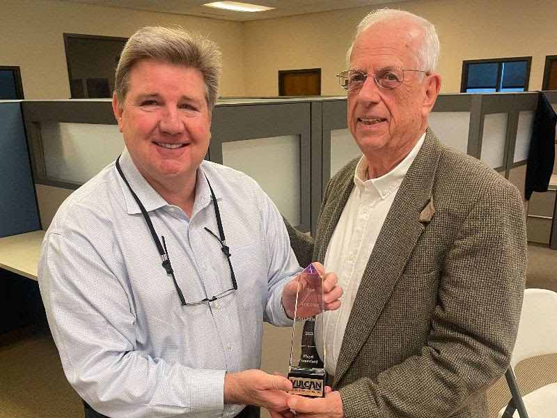 Steve Browning presents the 2022 Top Volume Salesman award to Floyd Comerfeld. Floyd will celebrate his 24th year with Vulcan Steel in 2023 and brings over 62 years of experience to the team.