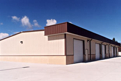 The sloped mansard/fascia is a structural projection from the sidewall or end wall that has a 3″/12″ slope. The back of the fascia can be sheeted or unsheeted, and it can have a soffit panel or be left open. It provides a different roofline with an architectural look.