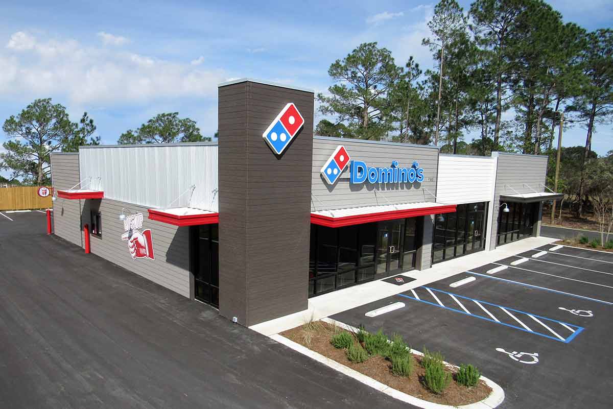 This Dominos restaurant in Pensacola, FL, adheres to all corporate branding expectations. It features a standing seam metal roof and multiple coordinated wall finishes.