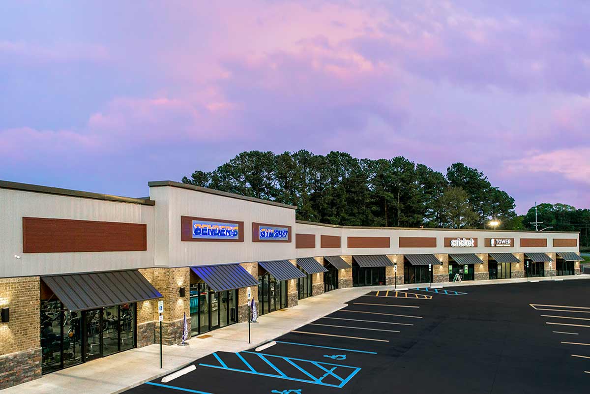 Located in Scottsboro, AL, the Pruett Place shopping center features single-slope buildings with parapets and reverse-rolled PBR wall panels.