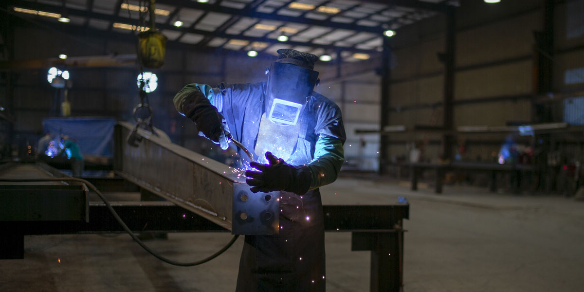 A certified welder fits and welds plates onto columns and rafters at the Vulcan Steel Structures, Inc. manufacturing facility in Adel, Georgia.