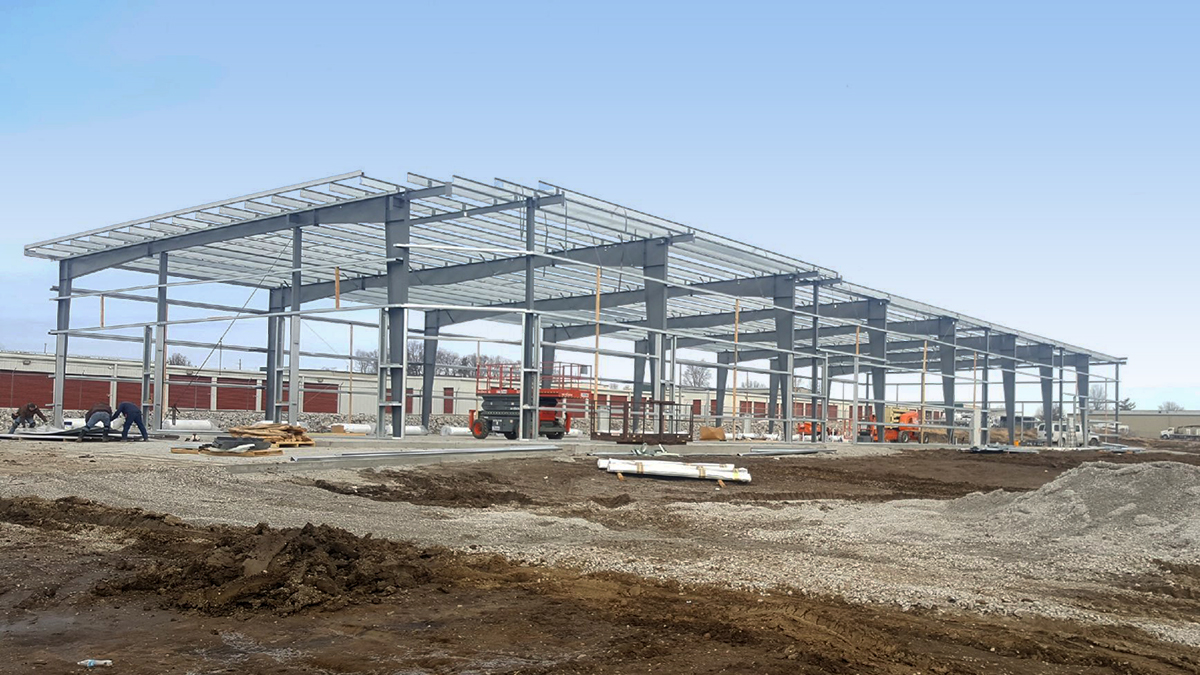 The Vulcan Steel Structures building is comprised of a 24-gauge Galvalume DL 324 roof, along with 26-gauge reverse-rolled PBR and AVP walls. It also includes the 26-gauge standard color PBR liner and has 5-to-6-foot mansard facades.