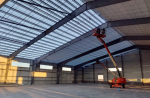 Vulcan Steel Structures manufactured the metal building hangar, designed by BCS Design, Inc and being erected by Cunningham Construction, Inc. both of Olathe, Kansas. The new building is 160 feet by 140 feet and has an eave height of 24′ 6″. The hangar includes a 100-foot-by-27.5-foot hangar door, a 24-gauge Galvalume DL324 roof, and 26-gauge standard color AVP Walls.