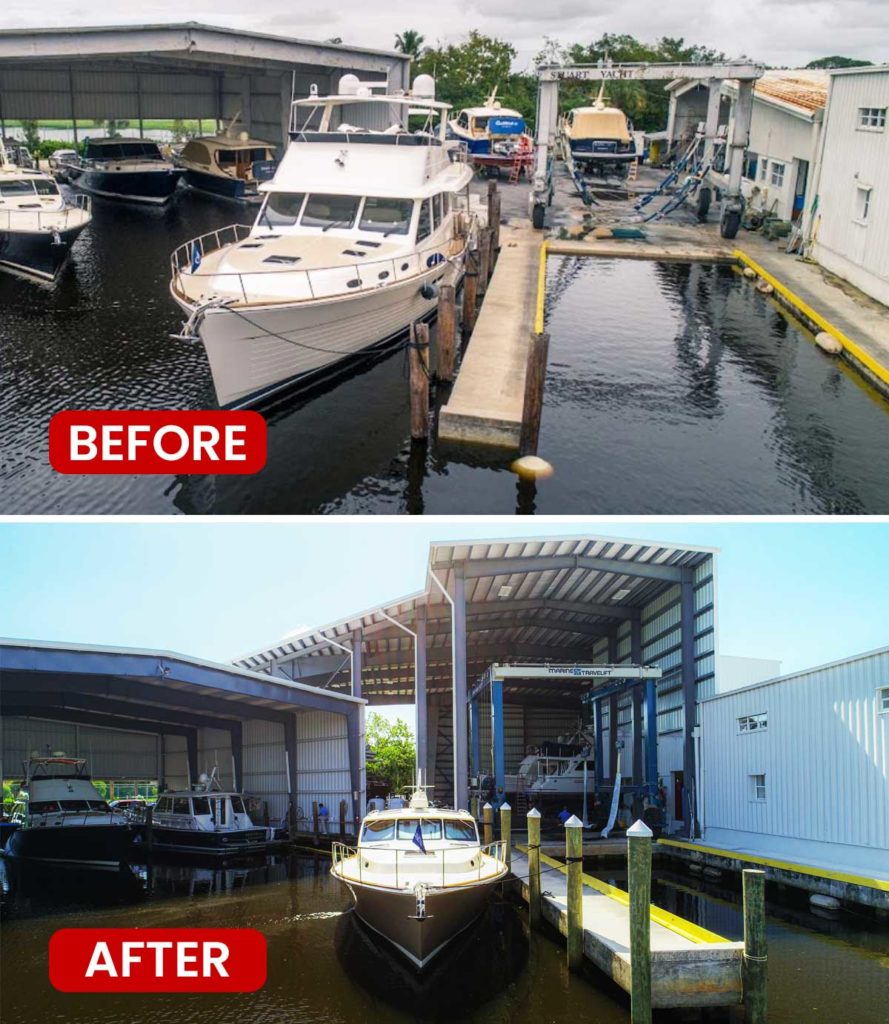 No ordinary facility will do when you serve some of the most expensive yachts from around the world. So, when Grand Banks Yachts decided to set up shop in Stuart, Florida they bought an existing 12,000-square-foot boatyard and planned a major renovation. The facility is now the US headquarters for Grand Banks Yachts and provides covered storage, slips, and a full-service boatyard with a 50-ton Travelift boat crane to serve the East Coast. Yachts travel the St Lucie River or the Lake Okeechobee lock system for after-sale service, maintenance, and upgrades.