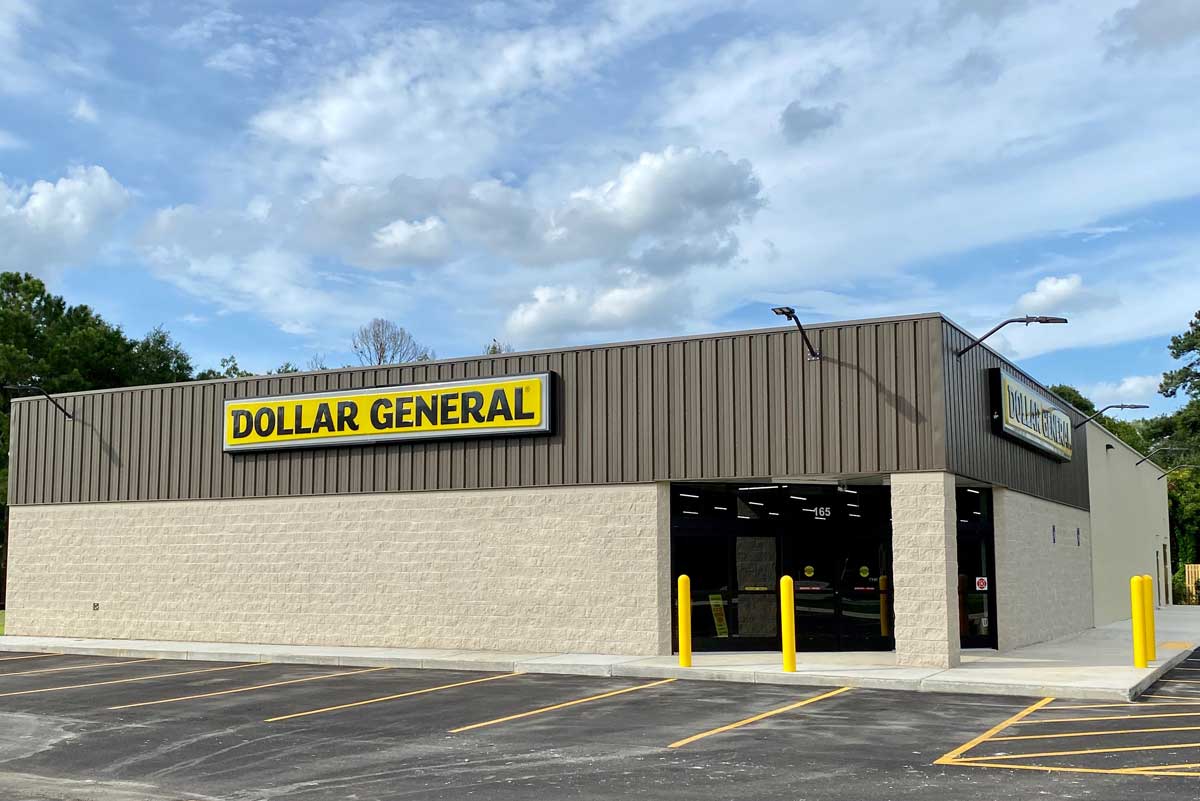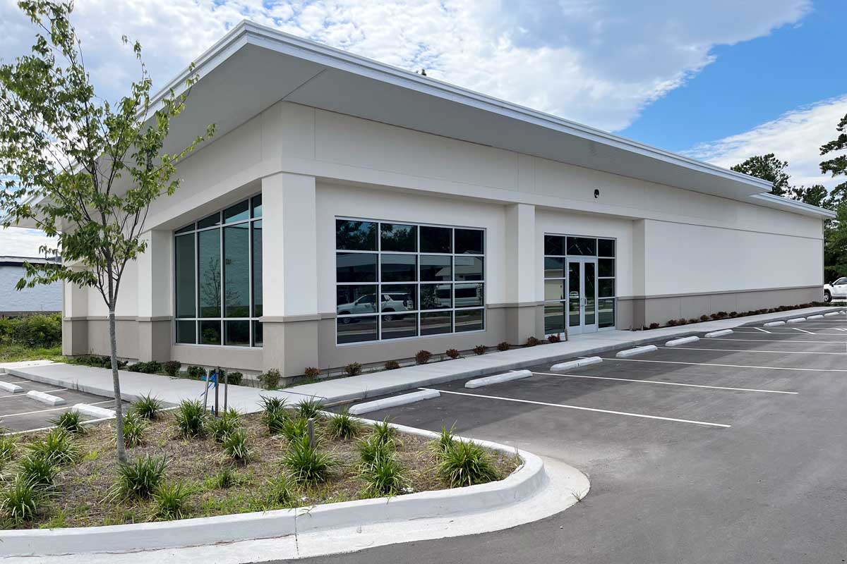 Several single-slope buildings were connected to form this shopping center in Macclenny, FL. The venue features a standing seam roof and parapet walls.