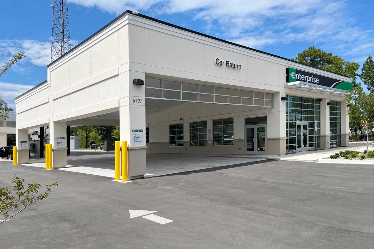 This Enterprise Car Rental facility is located in Wilmington, NC. It features a 4,620 square foot office with a 1,400 square foot fuel island. The roof system was a 24-gauge Galvalume SL216 Standing Seam and the exterior wall are EIFS.